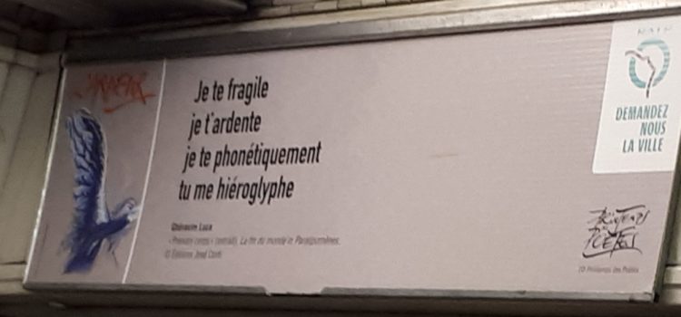 L’extrait d’un poème dans le métro, magnifique, aujourd’hui qui m’a fait penser à vous ! Je te fragile Je t’ardente Je te phonétiquement Tu me hiéroglyphe Ghérasim Luca « Prendre corps » Bien à vous ! Laurence Debeugny, animatrice du … Continuer la lecture