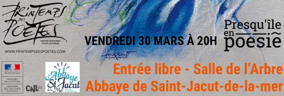Le Printemps des Poètes 2018 se décline à Saint-Jacut de la mer lors d’une soirée organisée à la Salle de l’Arbre de l’Abbaye, le 30 mars à partir de 20h00. Pour cette 20e édition du Printemps des Poètes -événement national-, L’Ardeur est le thème … Continuer la lecture